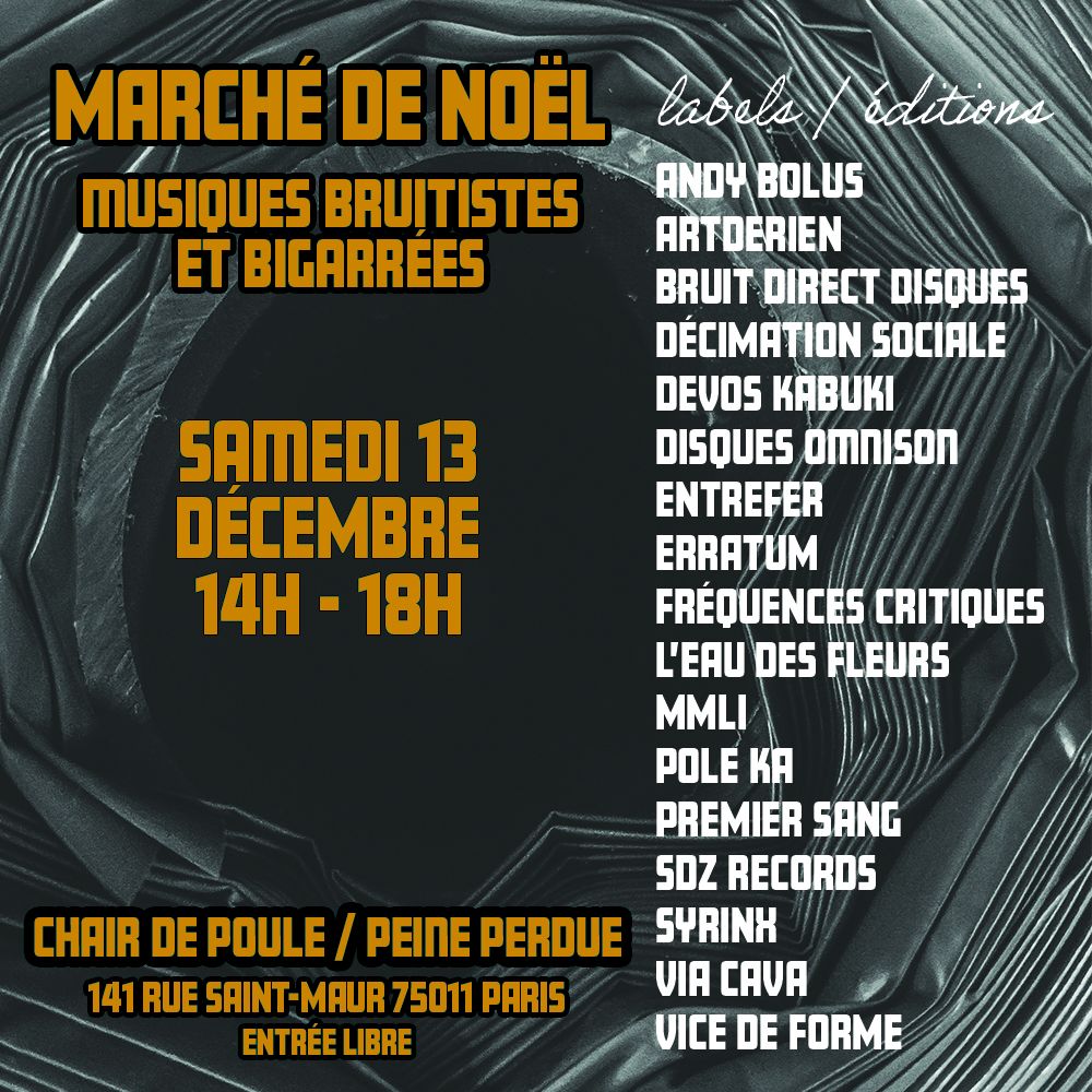 Le samedi 14 décembre, rendez-vous de 14h à 20h à l’ancienne Brasserie Bouchoule (à Montreuil) pour la 4ème édition du marché de Noël des musiques inclassées, organisé par Zone de Silence (Instants Chavirés + Collectif Coax + SP). Double stand Pole Ka / Vice de Forme pour l’occasion, au milieu d’une soixantaine d’exposant.e.s !