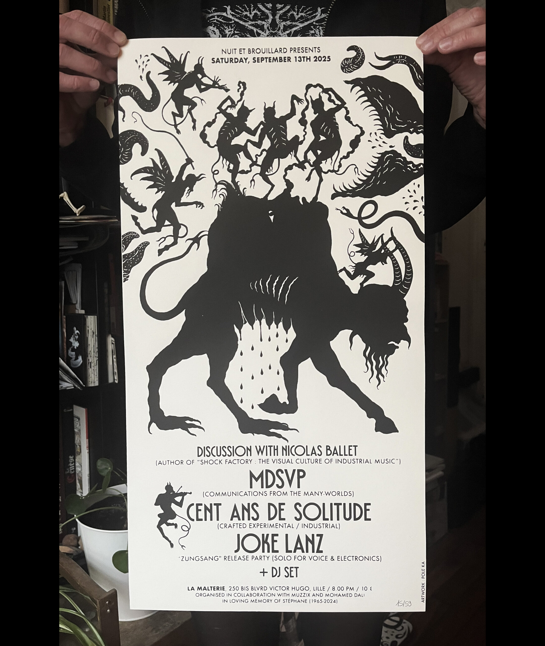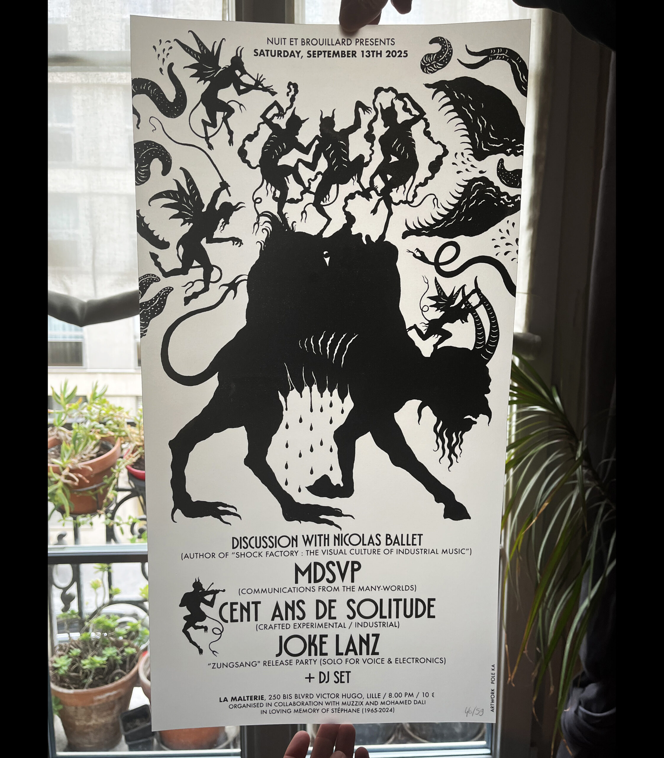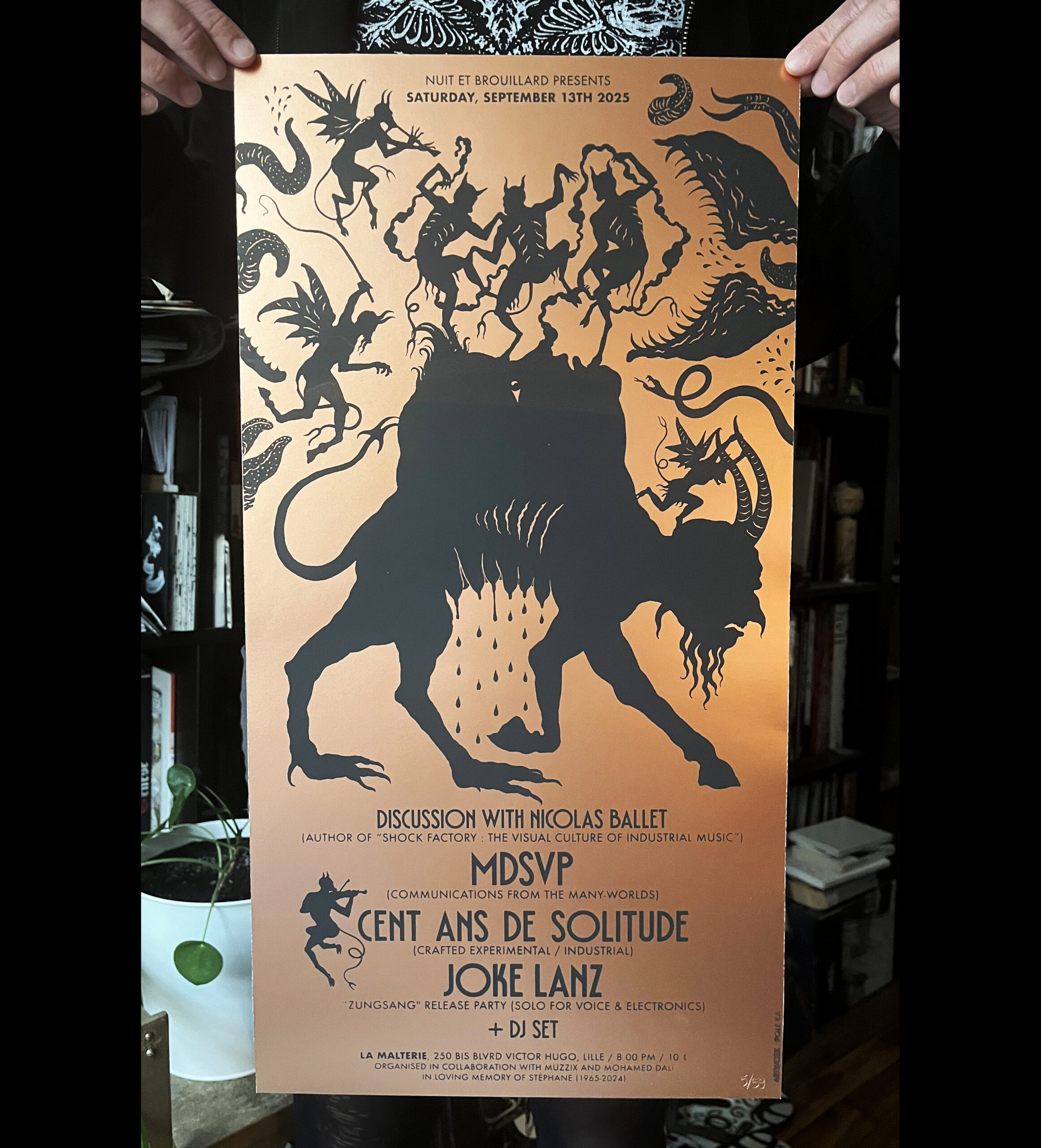 Encre noire sur papier cuivré, rouge, blanc, ou calque. 59 exemplaires numérotés.