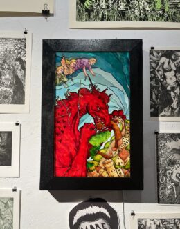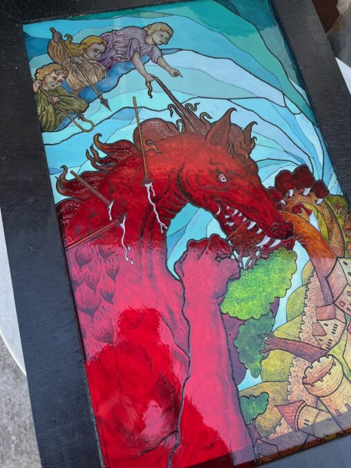 Peinture sur verre réalisée lors d’une semaine de résidence à l’Orbise (Pont d’Hérault dans les Cévennes). La scène est librement inspirée du mythe de la bête des Cévennes. Format 31 X 52 cm.