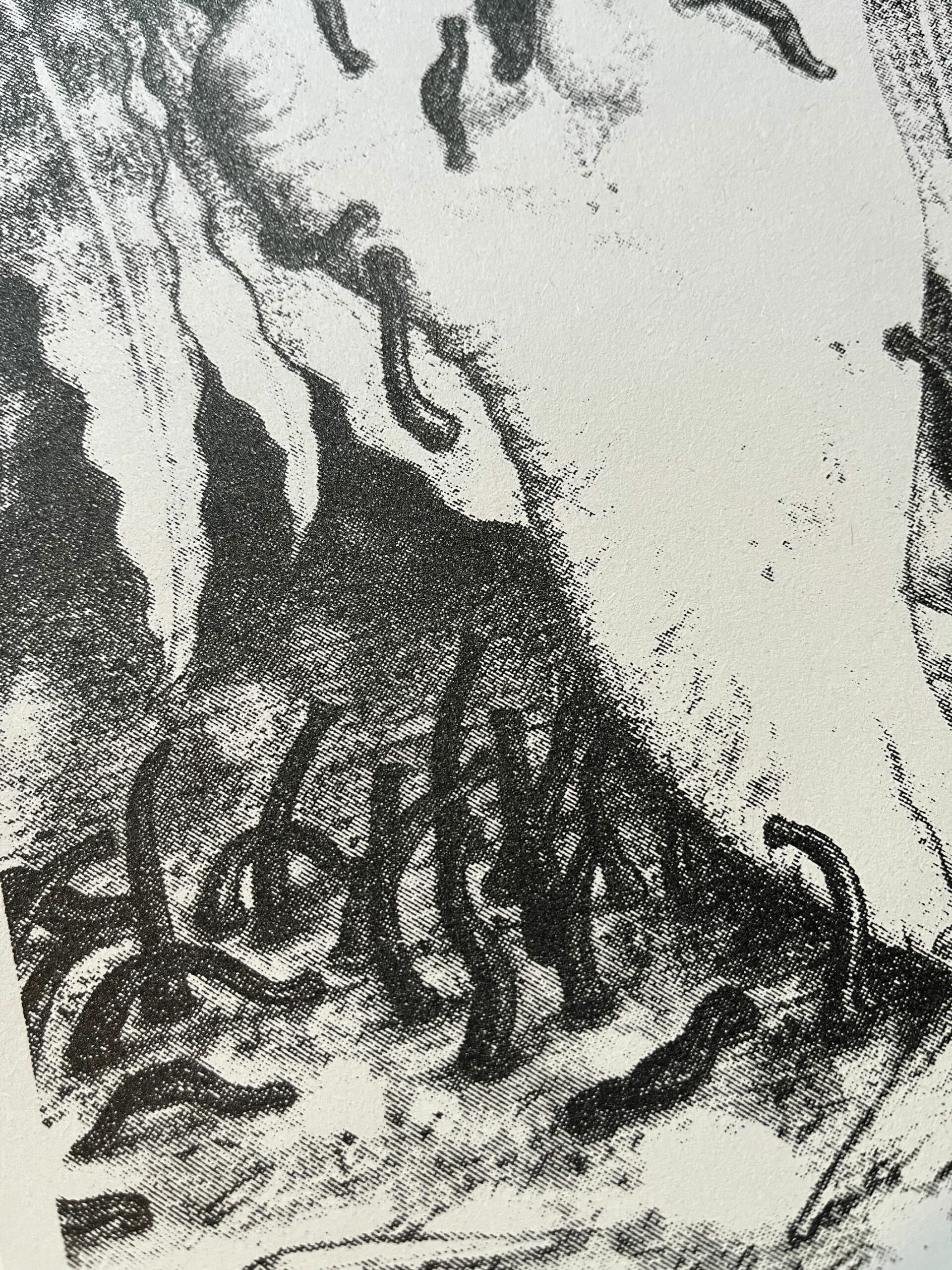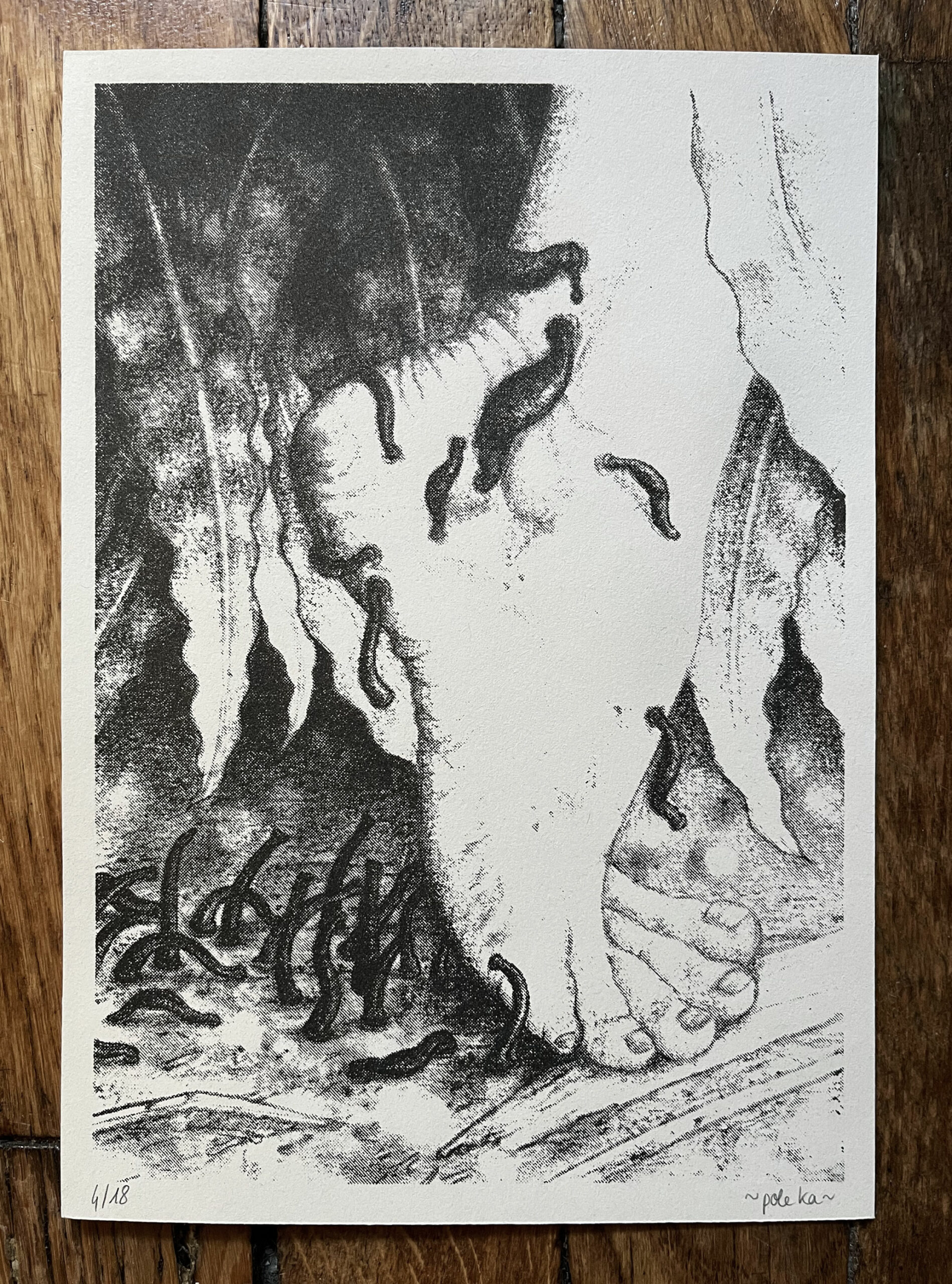 Dessin issu de la série « Souvenirs des îles Nansei », sérigraphié dans la cave. Encre noire pailletée sur papier beige, format 17,5 X 25,5, 18 exemplaires.
